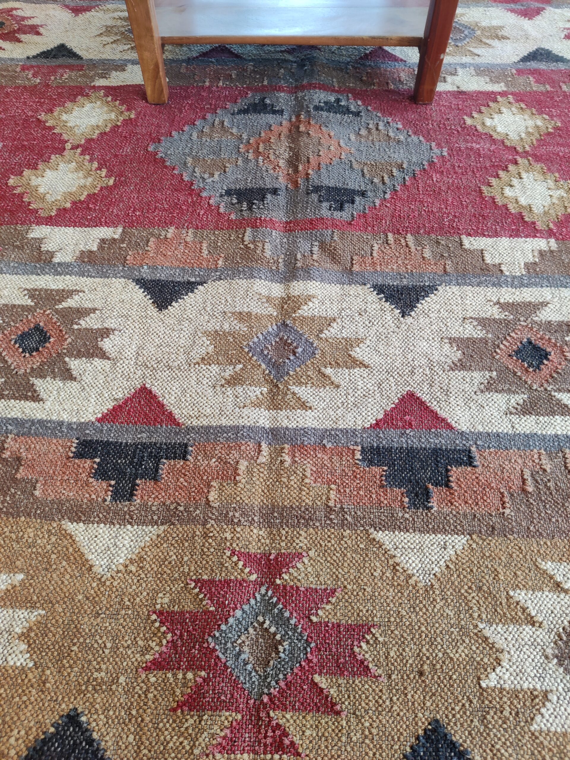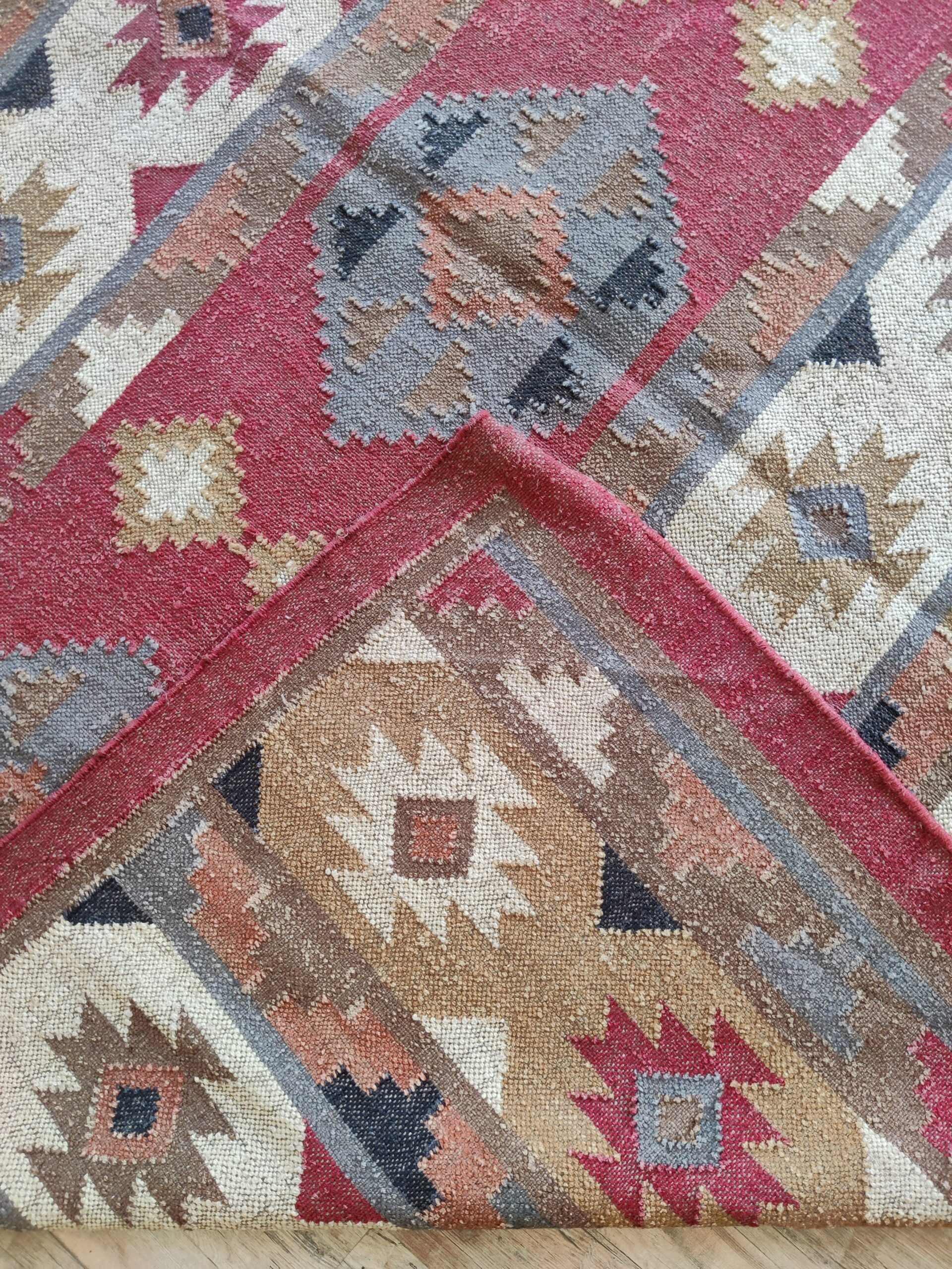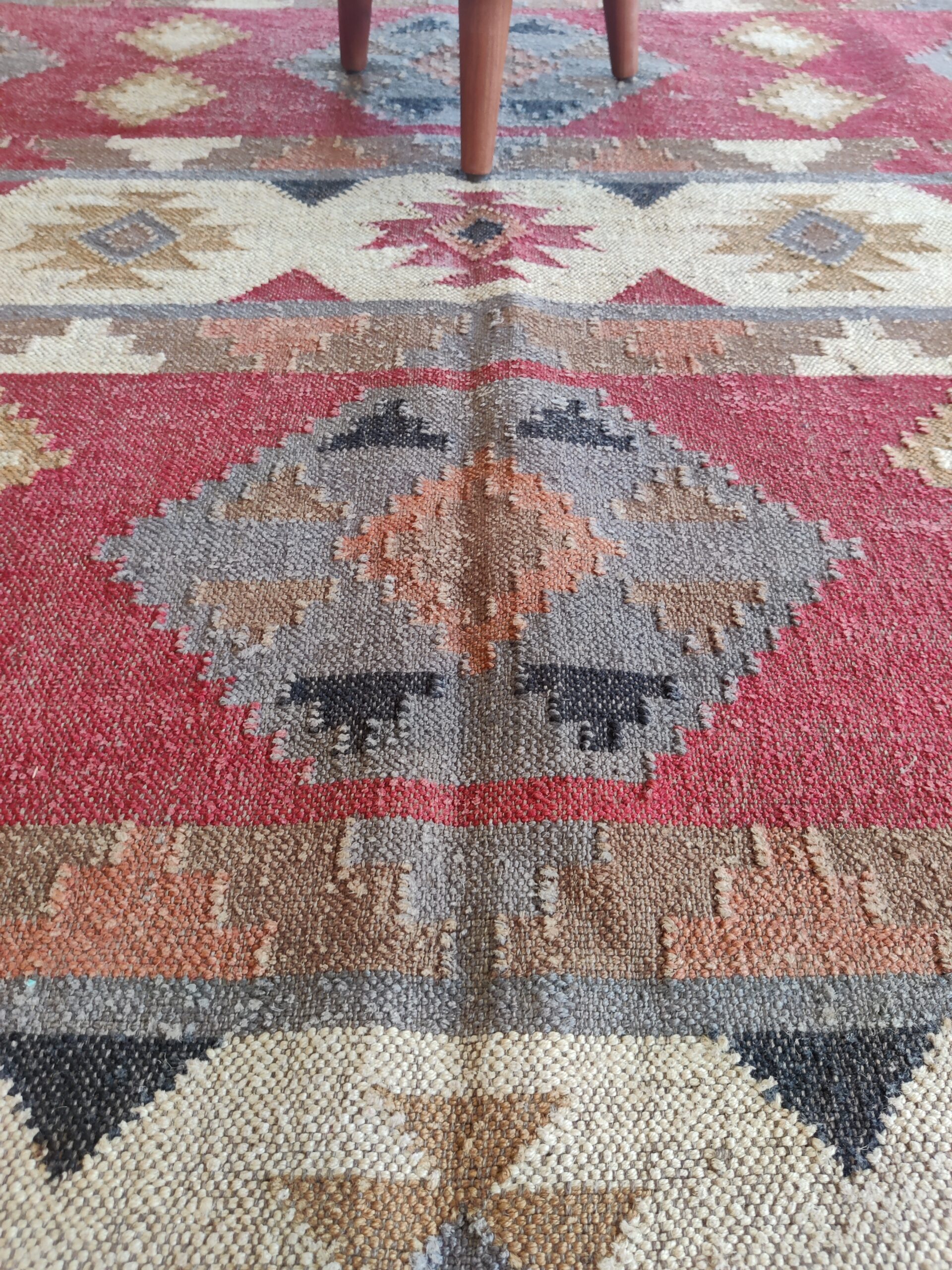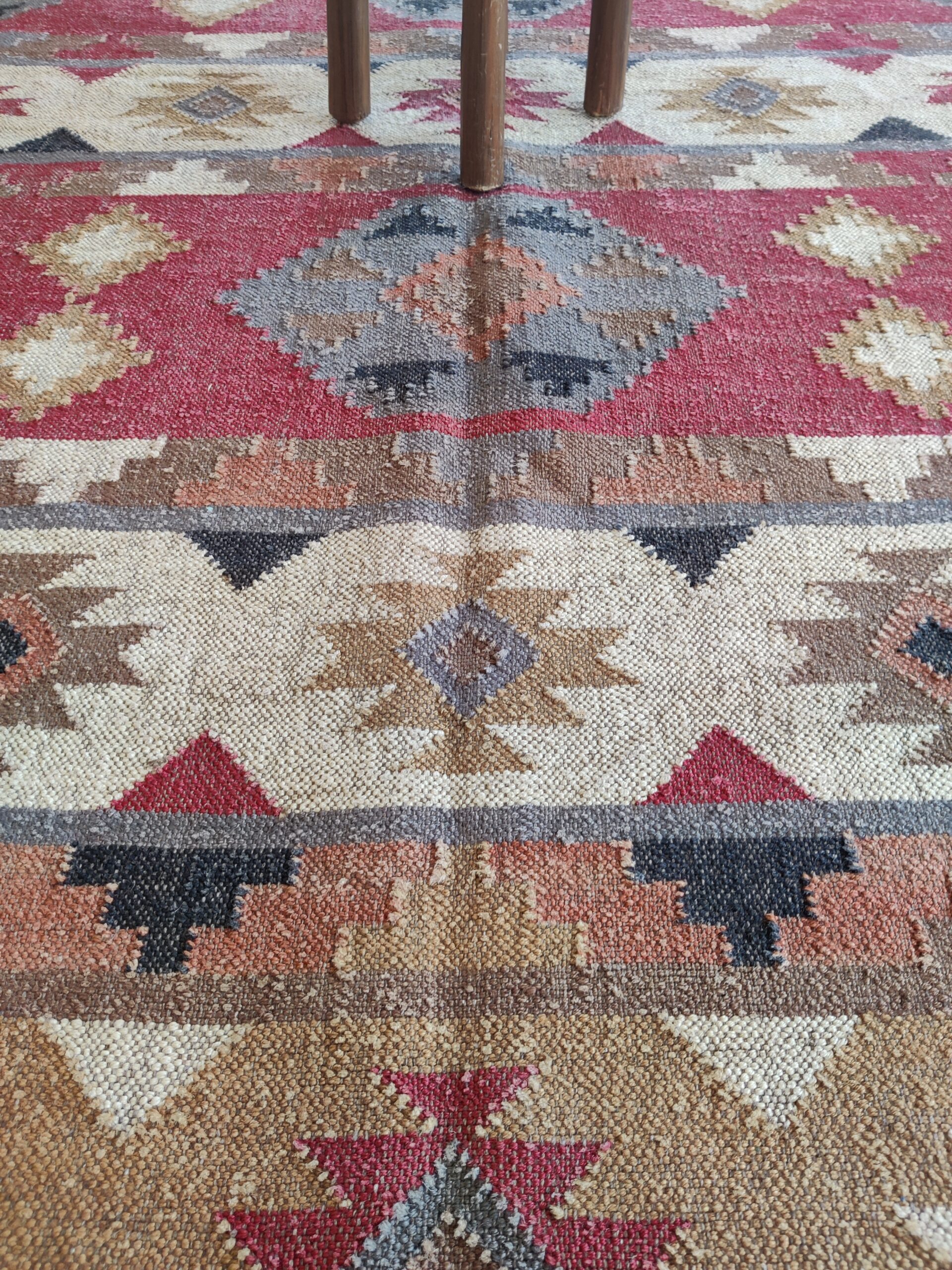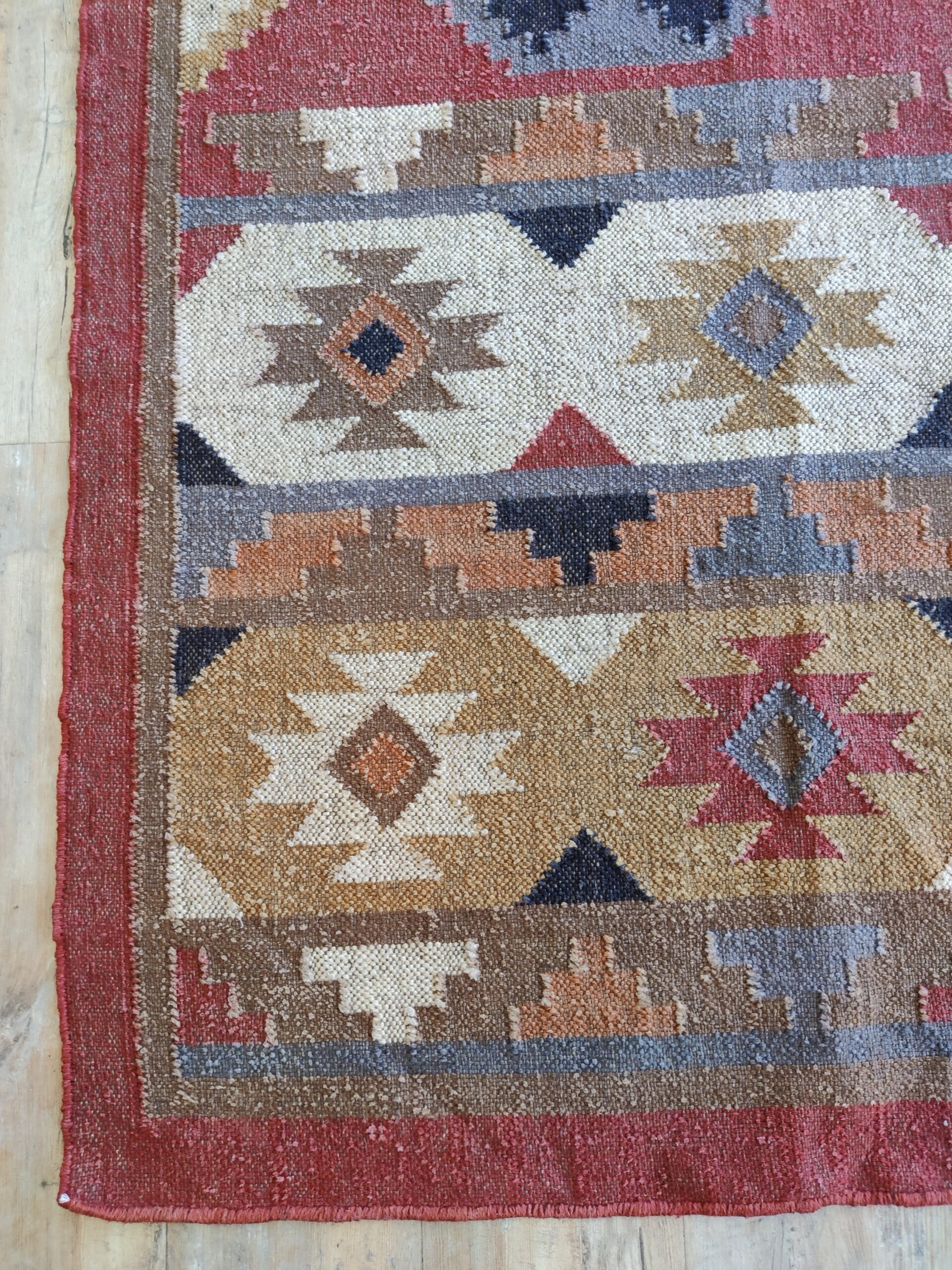 The Geometric design of a rust-color weaves its way seamlessly into any space from coastal dining to urban sleeping. Jute kilim dhurrie construction.