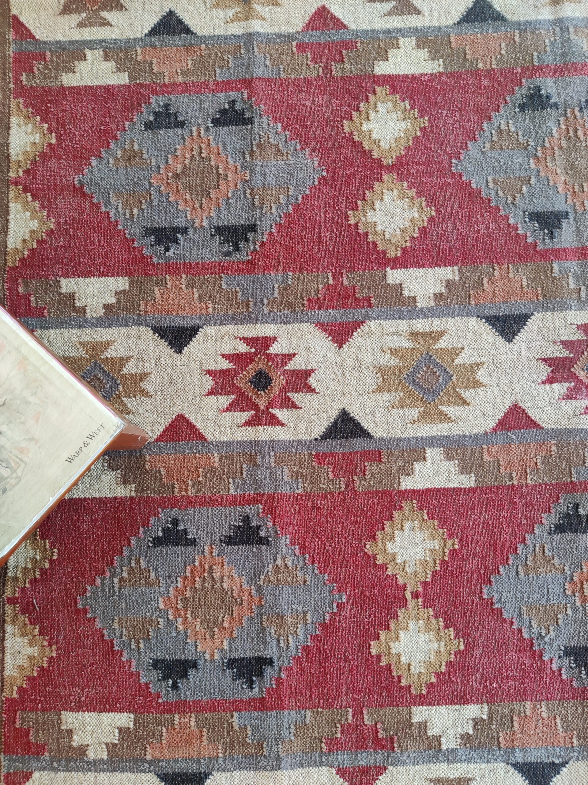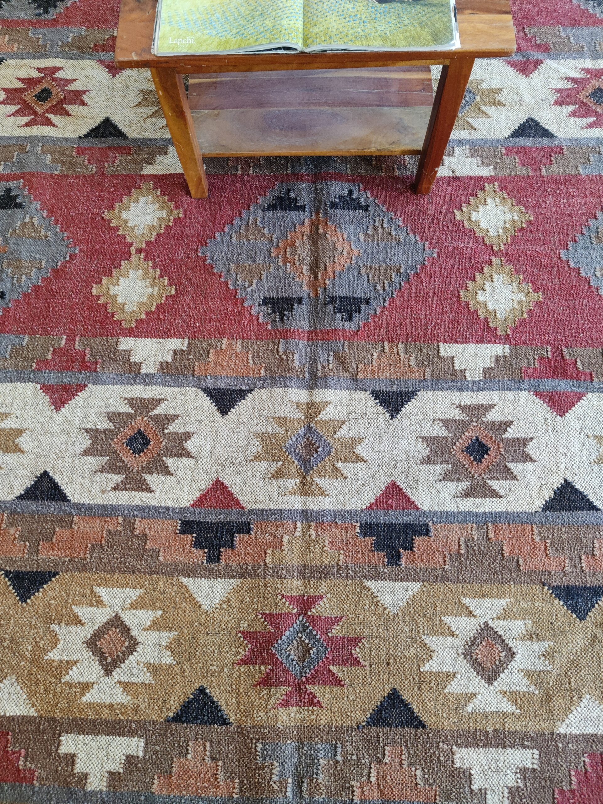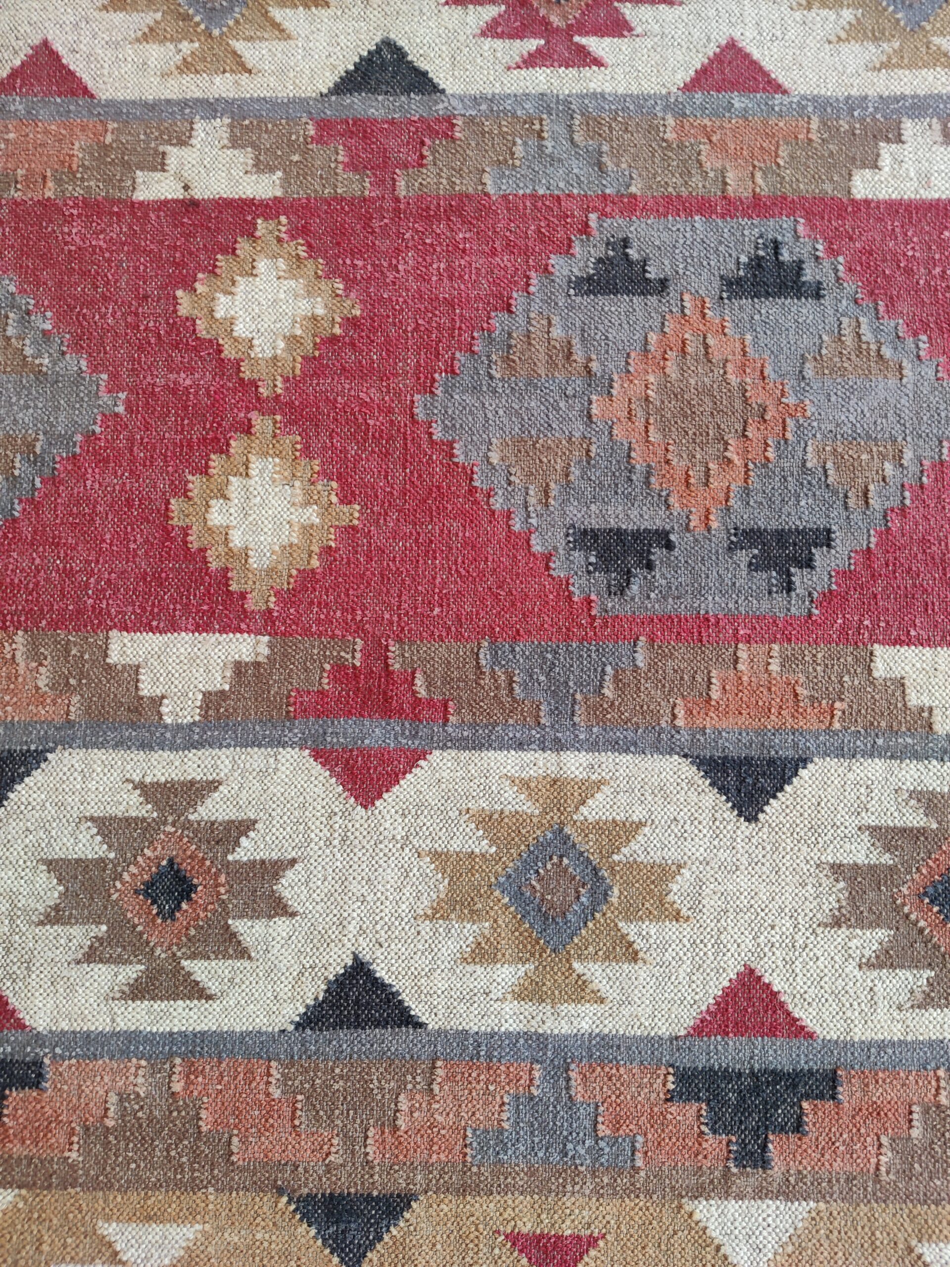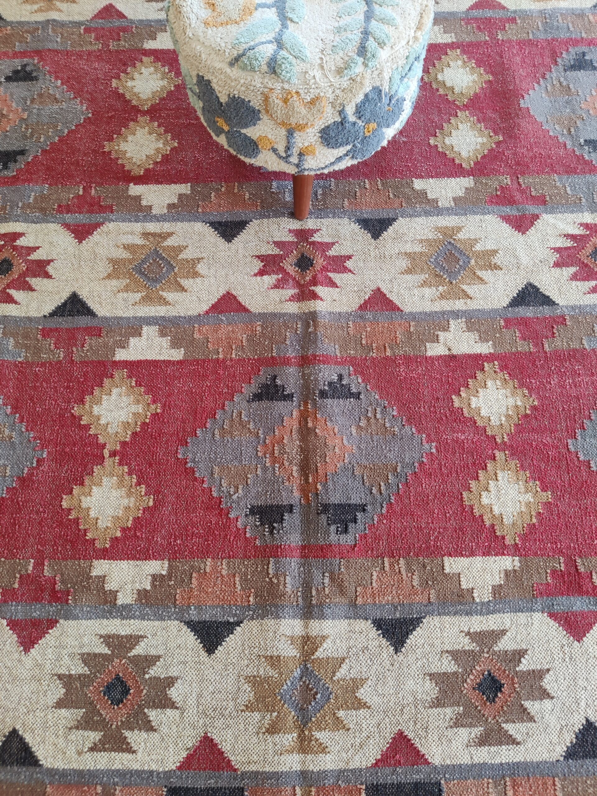 The Geometric design of a rust-color weaves its way seamlessly into any space from coastal dining to urban sleeping. Jute kilim dhurrie construction.