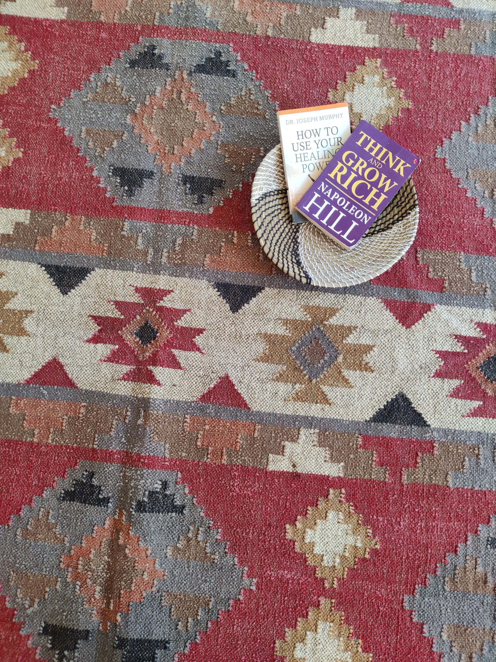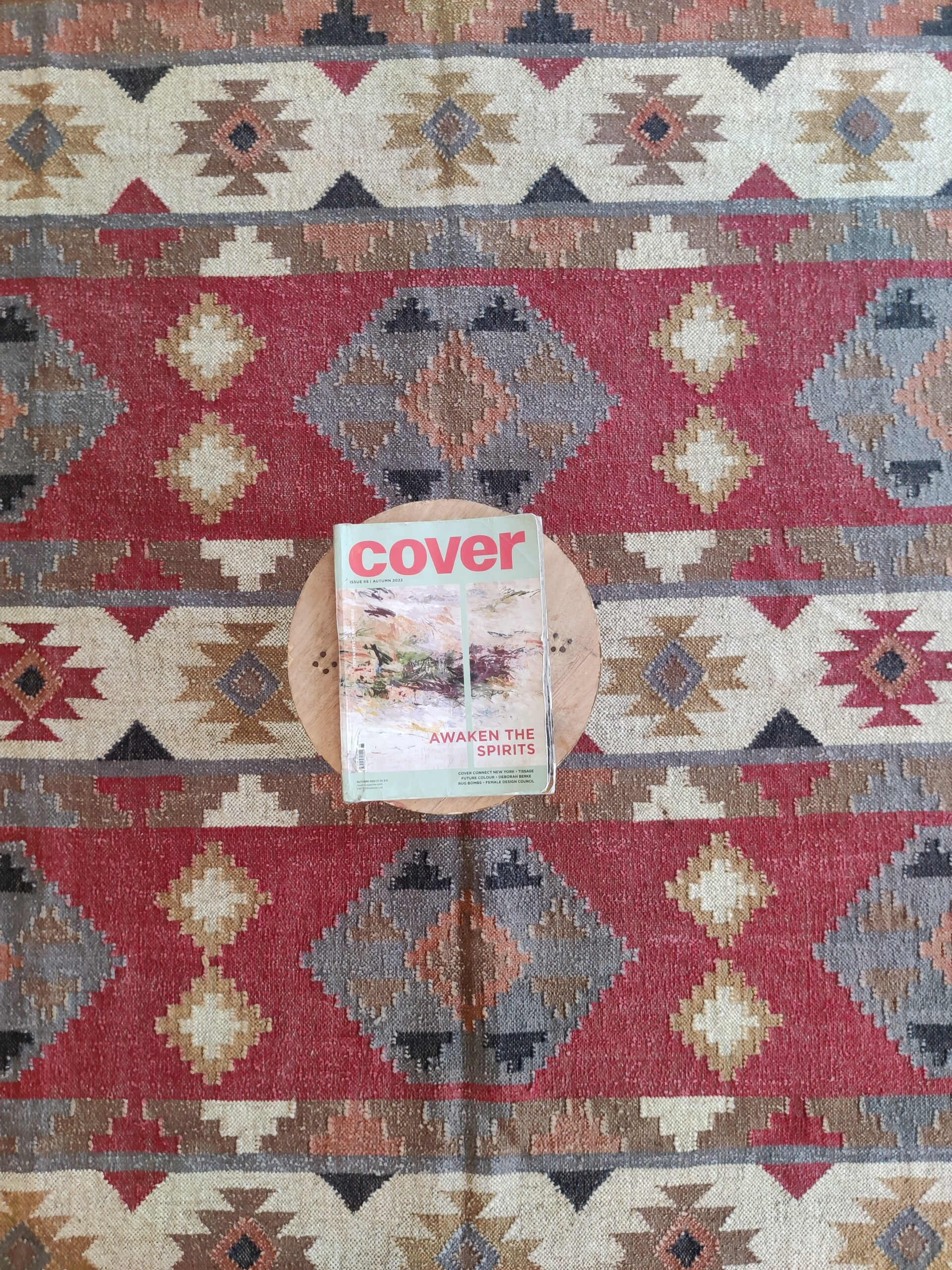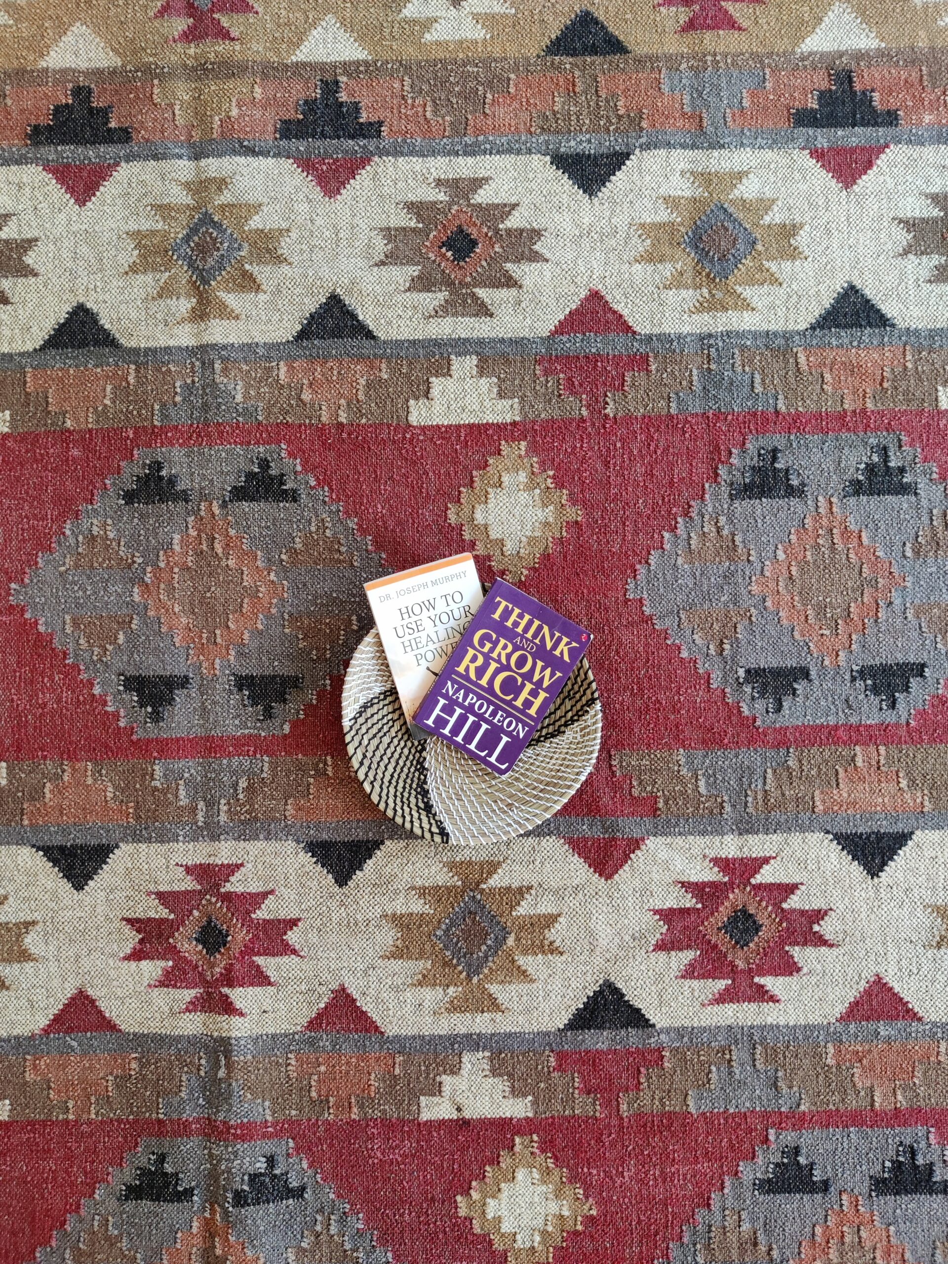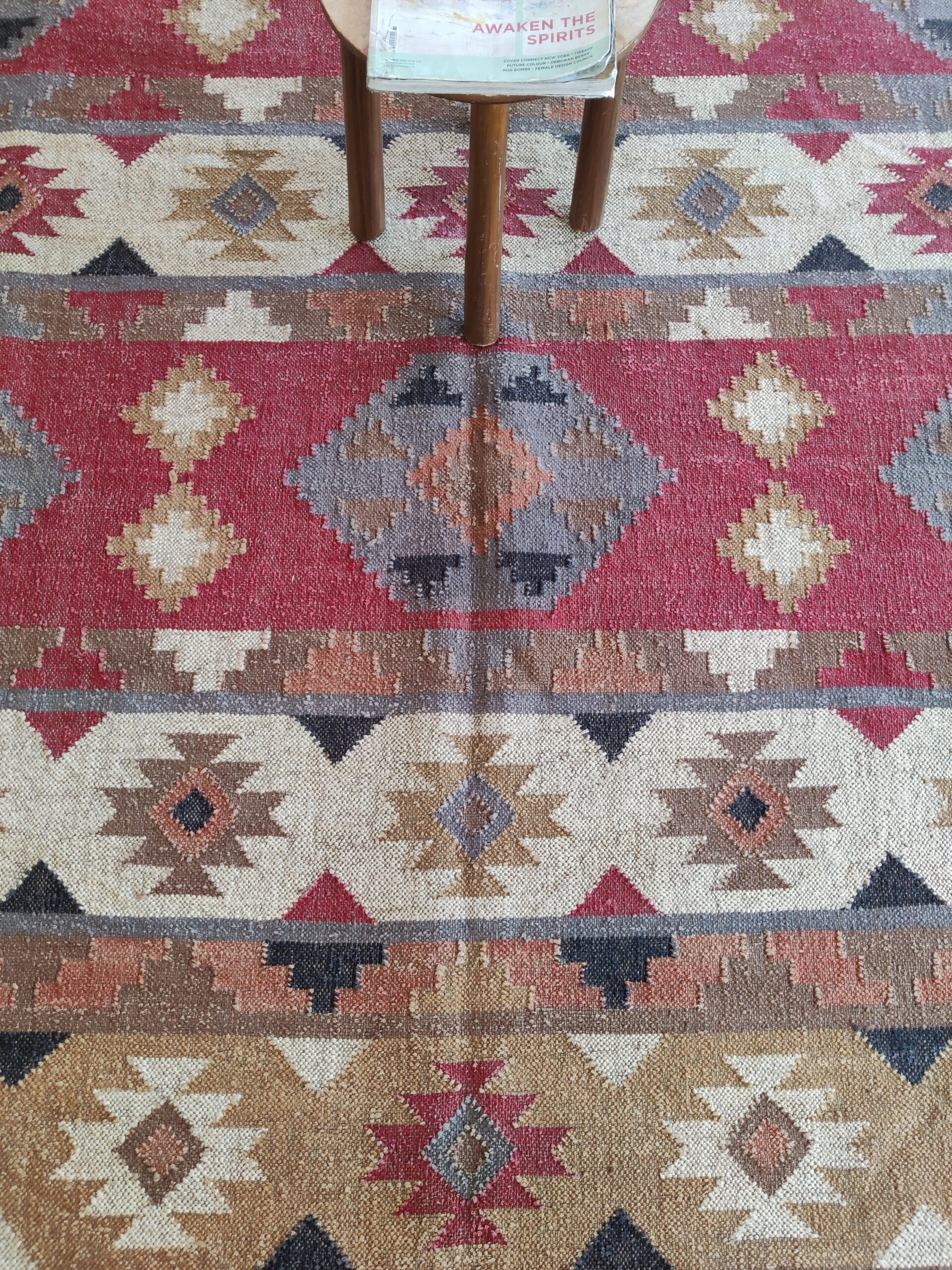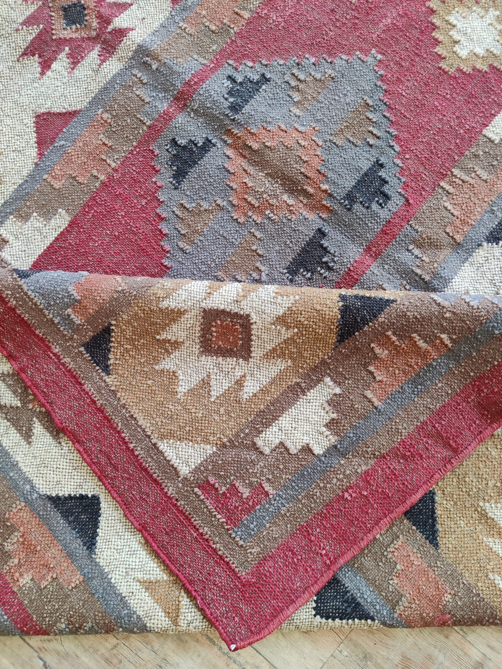 The Geometric design of a rust-color weaves its way seamlessly into any space from coastal dining to urban sleeping. Jute kilim dhurrie construction.