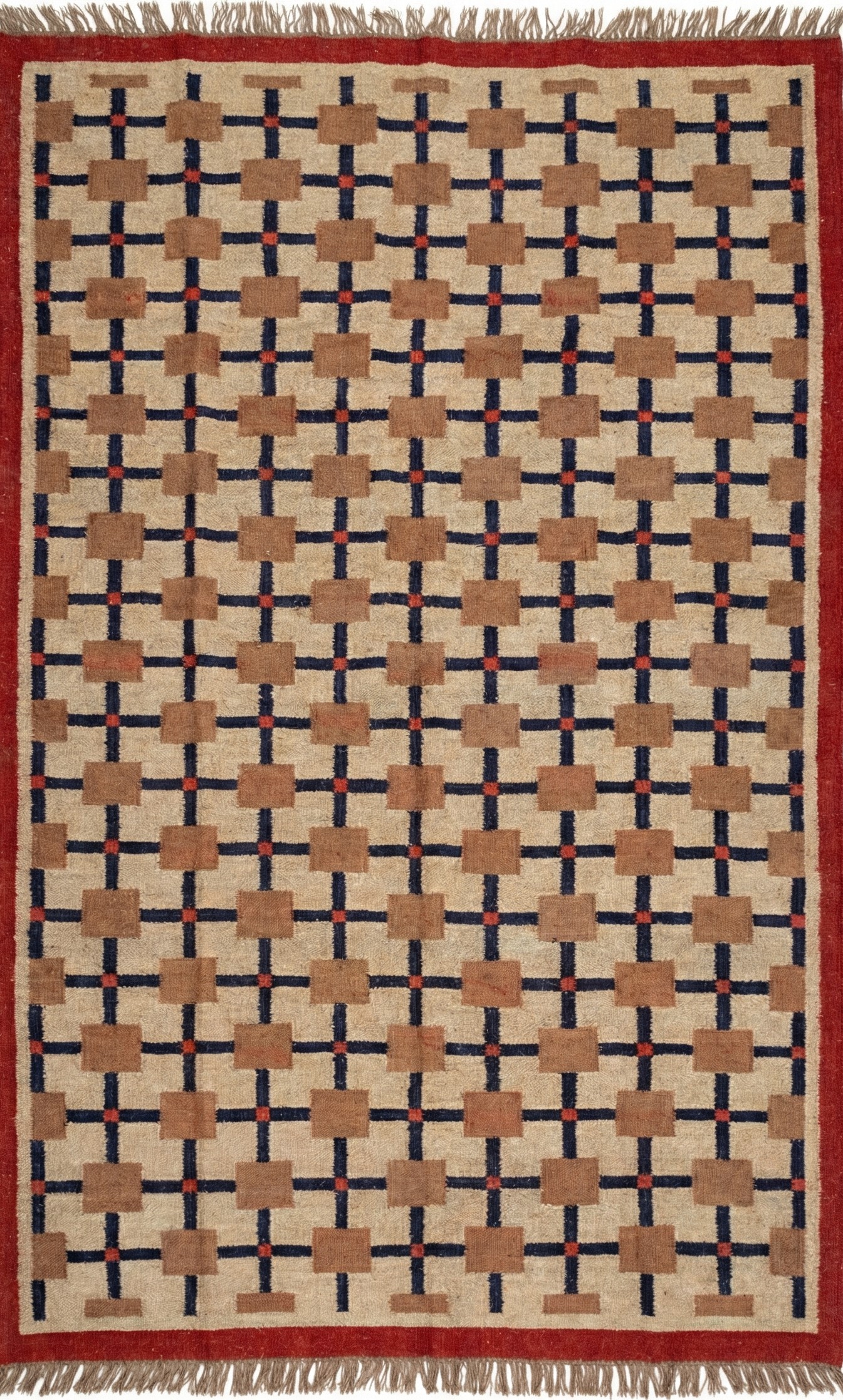 The Geometric design of a rust-color weaves its way seamlessly into any space from coastal dining to urban sleeping. Jute kilim dhurrie construction.