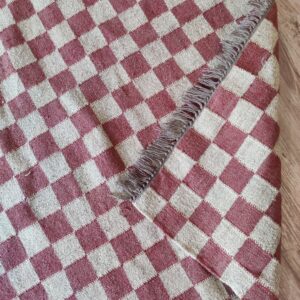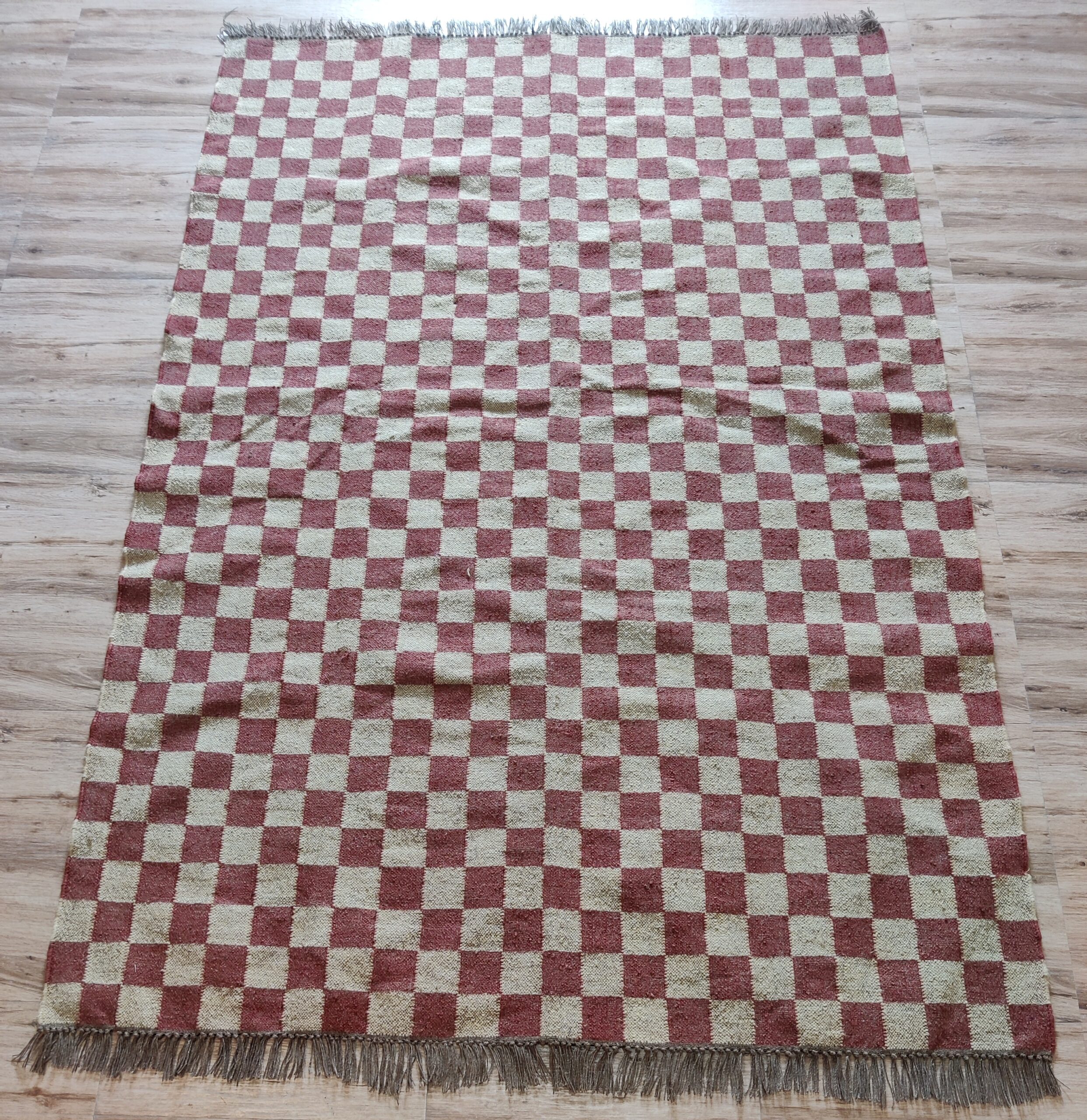 Handmade Beige And Pink Checkered Rug, Home And Living Room Rug, Wool Kilim Check Rug, Bedroom Rug